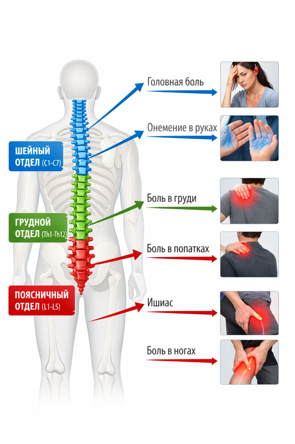 - Шейный отдел (C1-C7): Головные боли, головокружения, скачки давления, онемение пальцев рук, боль в плече.